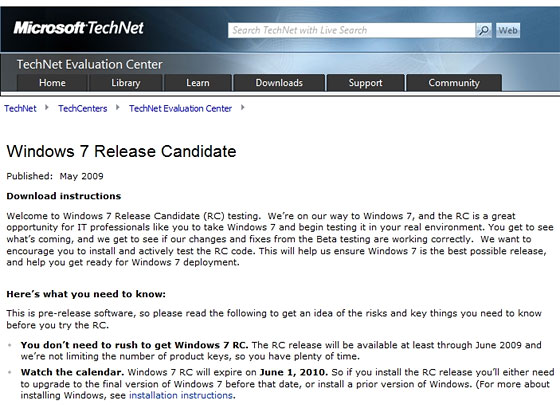 Thanks to some eagle eyed spotting by Ars Technica, we now know that the Windows 7 Release Candidate (RC) is slated for a May 2009 release-(that’s only 5 weeks away!) and will run through until June 2010.