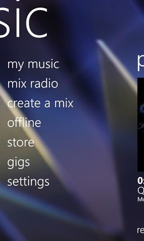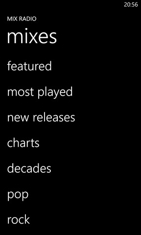 Nokia Music gives you access to 100’s of hours of music, for free, across a wide range of genres. When you enter the app, you see a “most recent” screen next to a screen listing the available sections: