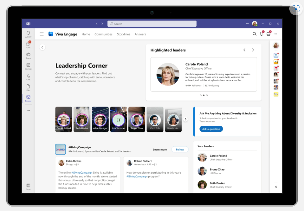 This, as the name suggests, has been developed to help leaders better communicate and connect with people across the organisation. It enables Ask Me Anything (AMA) events, surveys, and news to be published and, again, tracked with metrics and sentiment analysis.