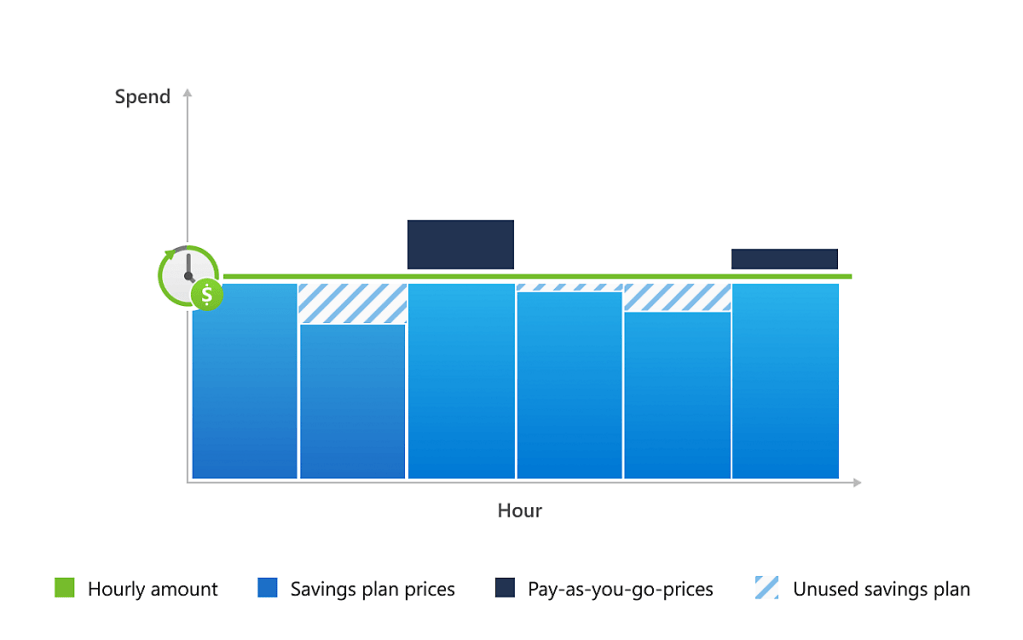 With savings plans, you commit to an hourly amount of Azure spend (say £5) and then any eligible services you use receive the discounted rate up to that amount. Anything over £5 will be charged at the regular PAYG rate: