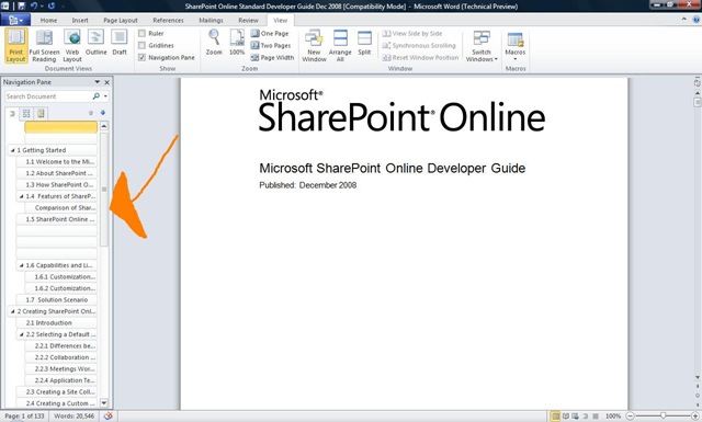 As you can see on the left hand side, the Navigation Pane has identified all the section headers in the document and allows you to jump around simply by clicking them-no more slightly random scrolling up and down 🙂 This is a truly great addition!