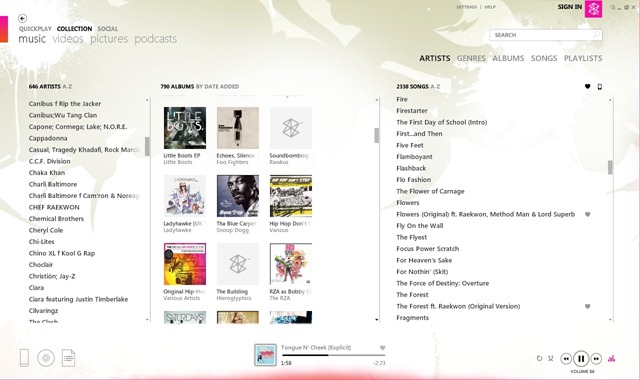 Rather than them being separate section as in WMP, you can see Artists, Albums and individual songs all at once. This section has got a very current, web 2.0 app style feel and I’m a big fan.