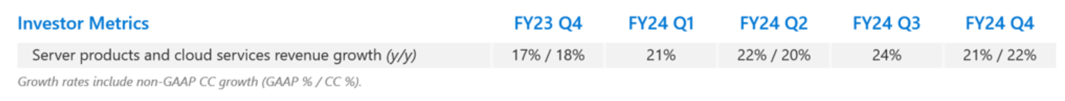 Azure (and other cloud services) growth was 29% for this quarter, a little drop from the percentage point increase of the last 2 quarters but, as it’s Q4, likely increasing from a higher base. Microsoft highlight that 8 points of this growth was from AI services.