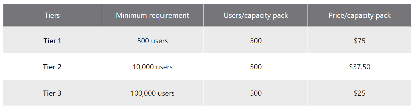 There is also promotional pricing available for Power Apps Portals login capacity – both for Tier 4 (25,000+ logins per month) and Tier 5 (100,000+ logins per month).
