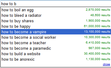 One thing I find a little odd (what with it being the internet) is that “porn” doesn’t come up with any suggestions…I was at least expecting to see “How to become a porn star” but no! However, there are 54,000 searches for: