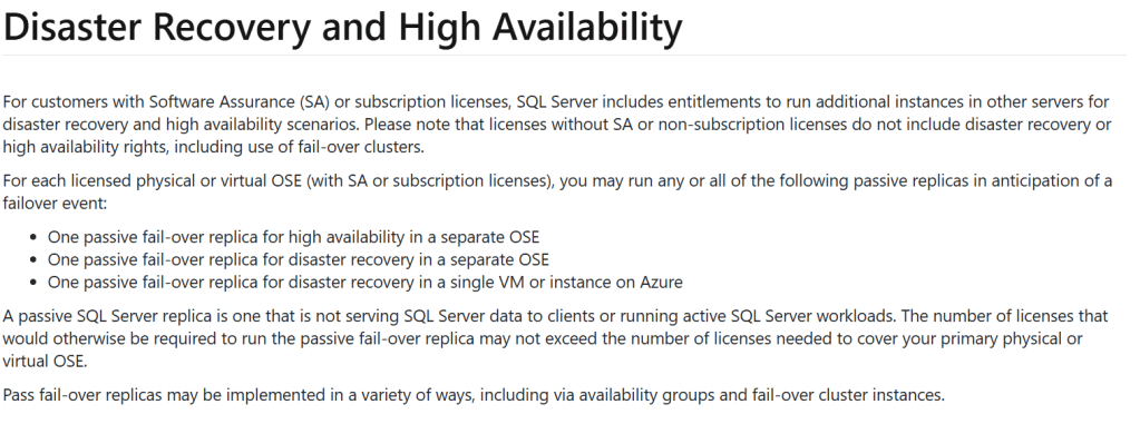 If you’re not familiar with this right it means, in a nutshell, that organisations who purchase SQL Server licenses with Software Assurance (SA) may license additional servers at no extra cost, as long as those servers are used only for disaster recovery/failover purposes. This is a long standing and widely used benefit – removing this right will mean one of 2 things: