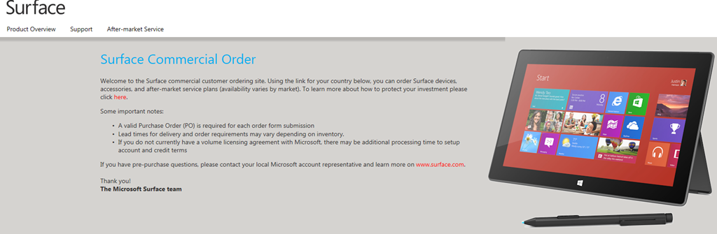 Welcome to the Surface commercial customer ordering site. Using the link for your country below, you can order Surface devices, accessories, and after-market service plans (availability varies by market).